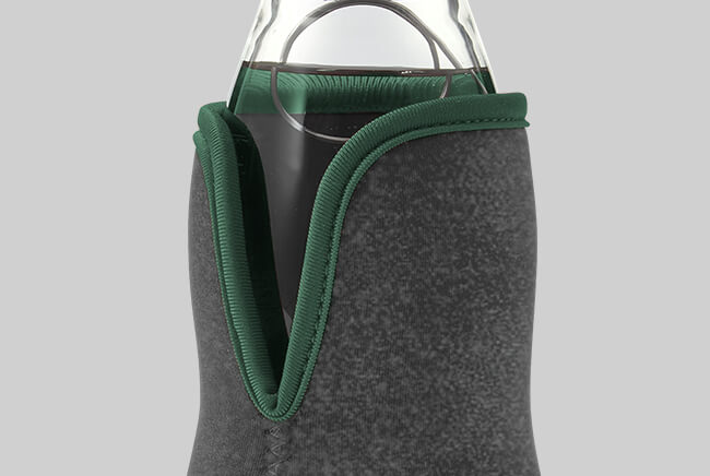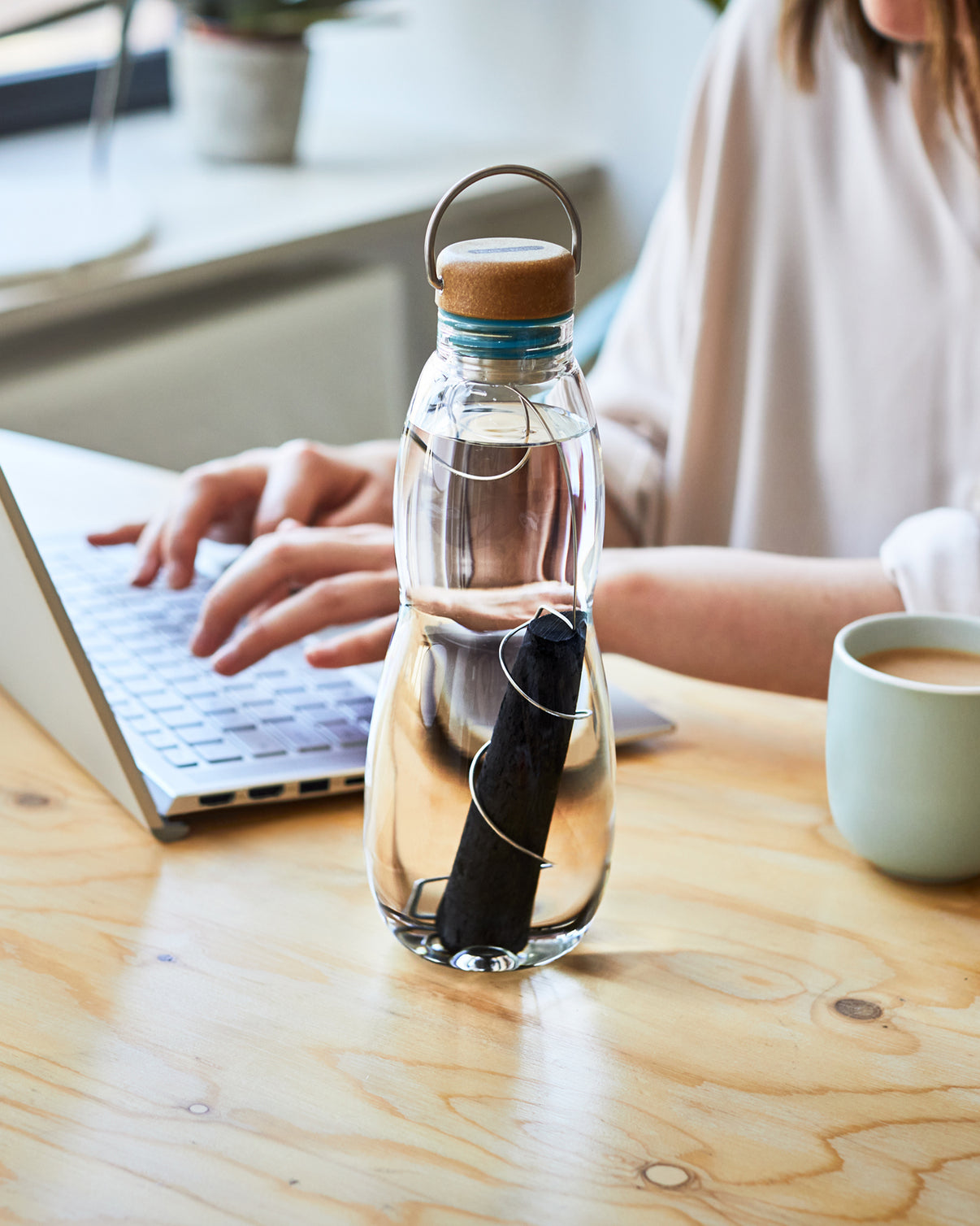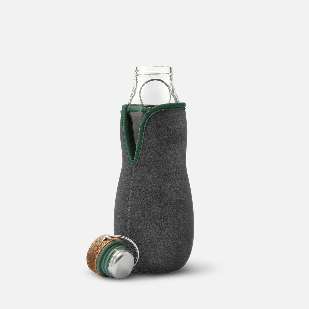 We wanted to upgrade our glass filter bottle. A threaded lid makes it easier to open and close. It requires skilled glassmakers to hand blow this detail but ensures that the bottle is a pleasure to drink from. The wood fibre lid has the same visual appeal as the original cork design but is harder. The silicone seal is easy to remove (and reapply) for thorough cleaning and the stainless steel cap on the underside ensures a plastic-free contact with your water. One of the biggest improvements was changing the sleeve from neoprene (not environmentally friendly) to a recycled polyester that still protects and insulates the water inside. The visual appeal of the design remains, but the new design is more robust for on-the-go use.